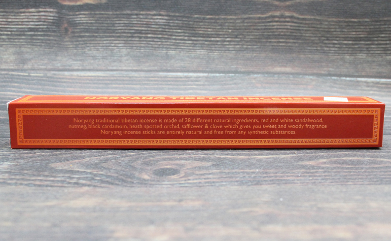 ノリャンチベタンインセンスはレッドとホワイトサンダルウッド、ナツメグ、ブラックカルダモン、スポッテッド・オーキッド、サフラン、クローブなど28種類の天然成分から作られています。甘くウッディな香りが特徴です。